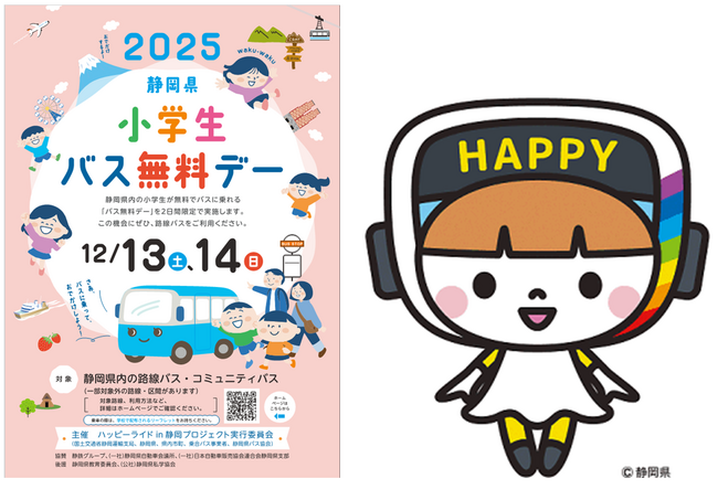 (左:周知用チラシ、右:静岡県のバスの妖精「ハッピー」)
