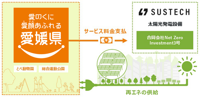 株式会社Sustech(東京都港区、代表取締役:丹野裕介・飯田祐一郎/以下、Sustech)は、同社のプロジェクト会社(SPC)である合同会社NET ZERO INVESTMENT3号を通じ、愛媛県が推進する「とべもり+(プラス)ゼロカーボン夢プロジェクト」の一環として、愛媛県の施設として初のPPA方式による太陽光発電設備の導入工事を開始しました。