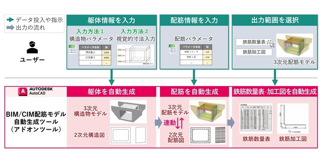 土木事業では、生産性の向上を目的として、3次元モデルとなるBIM/CIMモデルの活用が進んでいますが、現状では発注者へ納品する2次元図面を作成した後に、BIM/CIMモデルを作成し、さらに2次元図面との整合を照査する必要があります。複雑な配筋モデルの構築には多大な時間を要することに加え、2次元図面とBIM/CIMモデル間の齟齬(そご)による手戻り作業が生じ、返って生産性を低下させる要因の一つとなっていました。