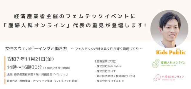 「誰もが成育過程を健やかに過ごせる社会の実現」をビジョンに掲げ、産婦人科・小児科に特化した遠隔健康医療相談サービスを展開する株式会社Kids Public(本社:東京都千代田区 代表: 橋本 直也 以下、当社)の「産婦人科オンライン」代表の重見 大介は、11月21日(金)に開催される経済産業省 令和7年度「フェムテック等サポートサービス実証事業」の一環として開催されるイベント「女性のウェルビーイングと働き方 ~ フェムテックが叶える女性が輝く職場づくり ~」に、プレゼンターとして登壇いたします。