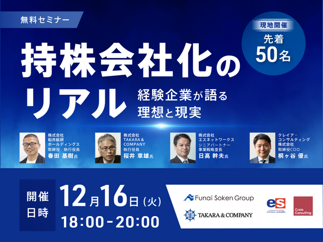 M&A仲介の株式会社ストライク(本社:東京都千代田区、代表取締役社長:荒井邦彦 以下「ストライク」)は、株式会社船井総研ホールディングス、株式会社TAKARA & COMPANY、株式会社エスネットワークス、クレイア・コンサルティング株式会社と共催で、2025年12月16日(火)に「持株会社化のリアル 経験企業が語る 理想と現実」と題した無料セミナーをハイブリッド形式(現地+オンライン)で開催いたします。