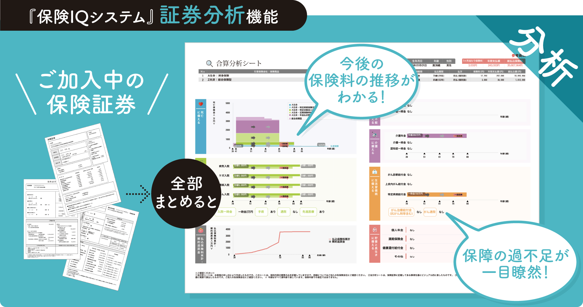 『保険クリニック(R)』では、独自開発の「保険IQシステム(R)」を利用し、コンサルタントの主観に偏らずお客様のご意向に沿った保険選びをお手伝いしております。 「保険IQシステム(R)」のメイン機能である「証券分析機能」と「比較機能」は非常にご好評いただいております。■証券分析機能■