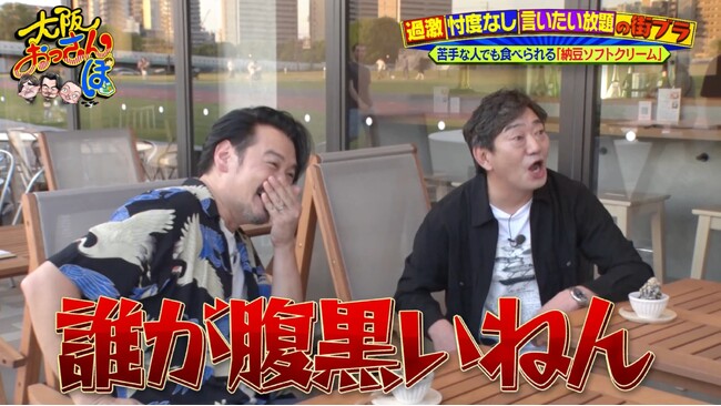 「こなっとうそふとくりぃむ」を注文し、「くろごま」「まっちゃ」「バニラ」の3種がおっさんたちの元に到着。それぞれどの味が合いそうか店員に決めてもらうと、黒田が合うと言われたのは「くろごま」。その理由を「腹黒いから」と言われ、黒田は「なんやこいつ!」とブチギレ!?