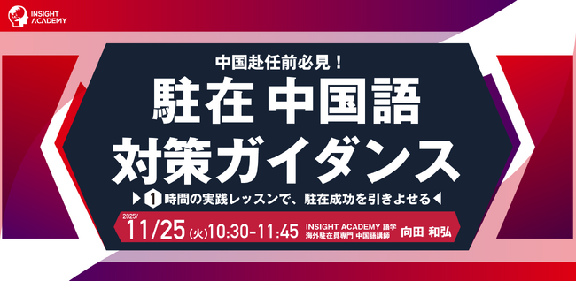 グローバル人材育成・研修業を手掛けるインサイトアカデミー株式会社(本社:東京都港区新橋、代表:金 珍燮)は、無料webセミナー「【中国赴任前必見!】”駐在中国語” 対策ガイダンス~1時間の実践レッスンで、駐在成功を引きよせる~」を開催致します。