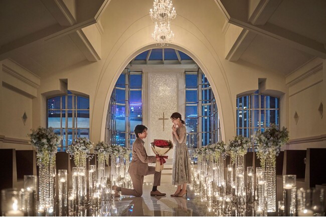 プロポーズの舞台となるのは、美しいみなとみらいの夜景が祭壇越しに広がるガラスのチャペル。20メートルのバージンロードにはキャンドルが美しく輝き、祭壇にはマザーオブパールと呼ばれる貝殻が張り巡らされ、横浜の空と海を感じられるチャペルをふたりきりで貸し切って、まるでドラマの主人公になったかのような、一生の想い出に残るロマンティックなプロポーズが叶います。