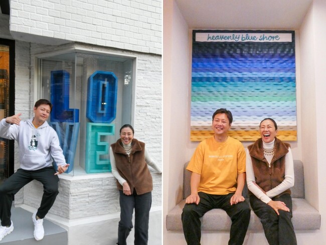 タレントRIKACO氏(右)と代表取締役社長CEO萩原利貴(左)「HEAVENLY BLUE SHORE」前にて。