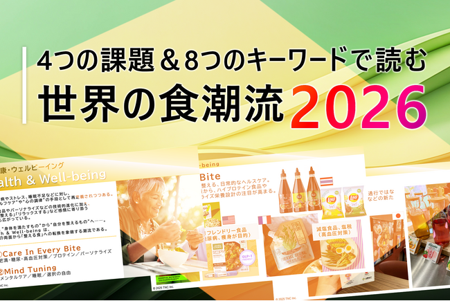 海外リサーチ・マーケティング及び商品開発・PR支援を行う株式会社TNC(本社:東京都渋谷区、代表取締役社長:小祝誉士夫)は、世界70ヵ国・100地域に広がる独自のリサーチネットワークと自社開発AIサービス「FOODIAL AI」を活用した、グローバルで共通する社会課題解決の糸口を見つける『世界の食潮流2026』を発表しました。