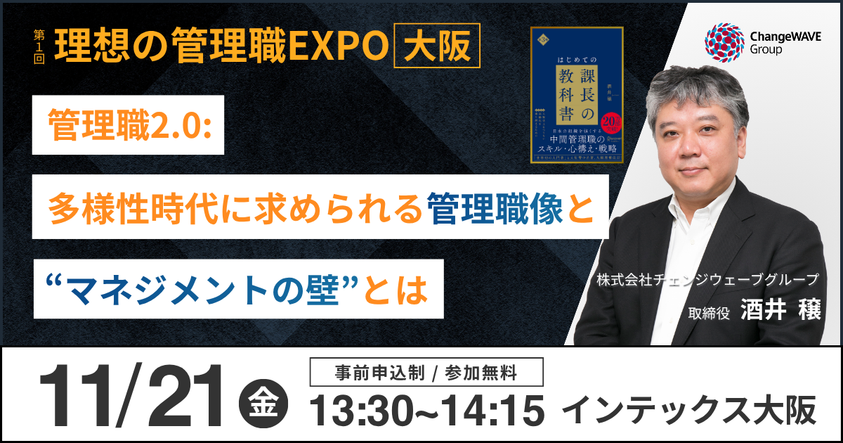 企業のダイバーシティ推進などの支援を行う株式会社チェンジウェーブグループ(本社:東京都港区、代表取締役社長/CEO:佐々木裕子)は、2025年11月21日(金)にインテックス大阪で開催される「第1回 理想の管理職EXPO【大阪】」において、取締役の酒井穣(さかい じょう)が開催記念講演に登壇することをお知らせいたします。