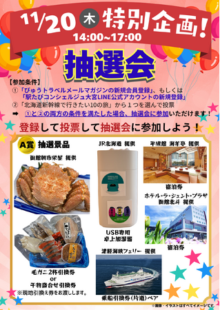 ●抽選会は、「びゅうトラベルメールマガジンの新規会員登録」、もしくは「駅たびコンシェルジュ大宮LINE公式アカウントの新規登録」と、『「北海道新幹線で行きたい10の旅」から1つを選んで投票』を行うと参加できます。