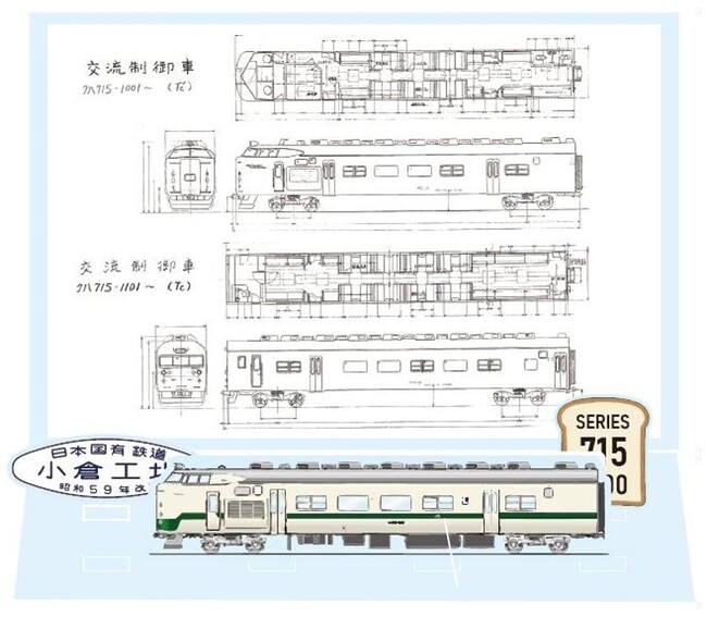 表面は715系1000番代、裏面は715系0番代と前身の581系の車両図面を使用し、581系からの改造の変遷や同じ交流専用の715系電車である715系0番代についても一緒に楽しめる商品です。