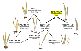 ウラボシ科ノキシノブ属(Lepisorus)は東アジアから東南アジアにかけて広く分布する着生のシダ植物で、世界に90種ほど存在することが知られています。このグループは形態的特徴に乏しく、正確に種を特定するには微小な形質の観察が必要なため、種の認識が非常に難しいシダの一つです。