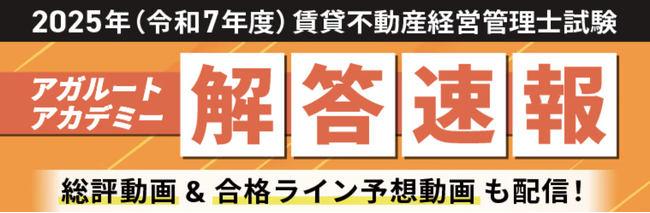 株式会社アガルート(本社:東京都新宿区、代表取締役:岩崎 北斗)が運営する「アガルートアカデミー」は、賃貸不動産経営管理士試験当日の11月16日(日)に 「解答速報」、「総評動画YouTubeLIVE配信」「合格ライン予想動画YouTubeLIVE配信」を無料で実施いたしました。また、「令和7年度 賃貸不動産経営管理士試験 解説講義」のプレゼントが決定いたしました。