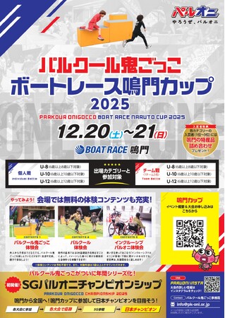 BOAT RACE 鳴門 で開催される「パルクール鬼ごっこボートレース鳴門カップ2025 」では、「あそびがカラダを作る!」をテーマに、パルクール鬼ごっこで楽しさとともに能力を向上させる、小学生以下及びその保護者を対象とした限定のイベントを12月20日(土)・21日(日)で2日間に渡り開催!