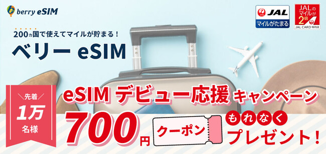 これまでも、JMB会員向けのウェブサイトより「ベリーeSIM(R)」をご購入いただいたお客様は、ご購入金額に応じてマイレージを貯めることができましたが、より気軽にeSIMをご利用いただく機会を通じて利便性をご体験いただくため、「ベリーeSIM(R)」の購入時にご利用いただける700円分のクーポンを、先着一万名様にもれなくご提供いたします。