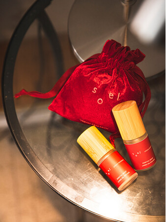 今回のオイルには、ホリデームードを纏った特別な「赤い巾着」もご用意。