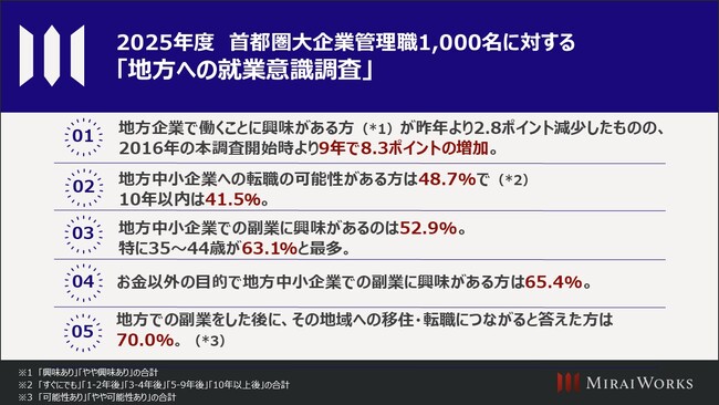 株式会社みらいワークス(本社:東京都港区、代表取締役社長 岡本 祥治、以下「当社」)は、首都圏の大企業に勤める管理職1,000名に対する「地方への就業意識調査」を実施しましたので、お知らせいたします。
