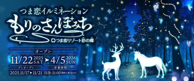 つま恋リゾート彩の郷(住所:静岡県掛川市満水2000番地 本社:ホテルマネージメントインターナショナル株式会社)は、童話の世界をイメージしたつま恋イルミネーション「もりのさんぽみち」を