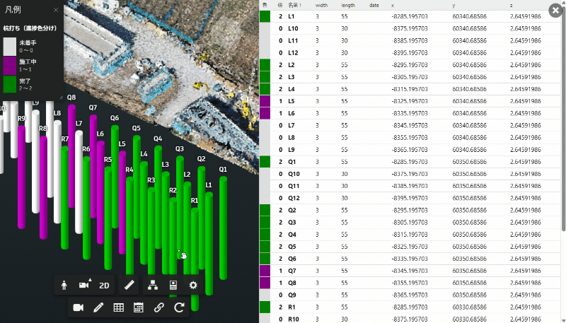 今回のアップデートでは、計測データの属性情報を「一覧表」で確認できるモードを追加実装しました。ボクセルに含水比や設計値などの属性情報を含めれば、BIMビューアと並べて参照できます。さらに、一覧表の行をクリックすれば対象グラフにフォーカス可能です。