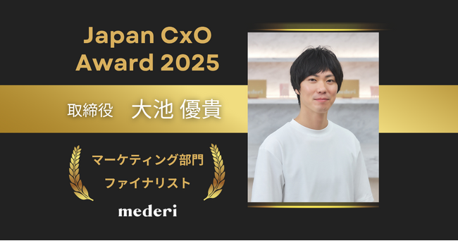 オンラインピル診療サービス『mederi Pill(メデリピル)』及び企業向け健康支援・福利厚生サービス「mederi for biz(メデリフォービズ)」を提供するmederi株式会社(本社:東京都目黒区、代表取締役 坂梨 亜里咲 以下、mederi)は、このたび、取締役 大池 優貴が「Japan CxO Award 2025」において、セールスマーケ部門 グロースクラスのファイナリストに選出されたことをお知らせいたします。