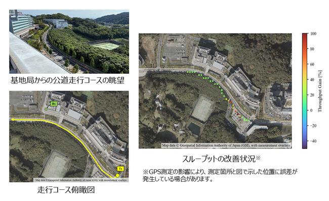 本実験から、緩やかなカーブを有する公道(コース1)や部分的に遮蔽物が存在する環境(コース2)のように、電波伝搬環境が変化し続ける環境下でもあっても、本技術を活用した通信は安定した通信を提供することが可能であり、従来の方式と比較して、コース全体を平均して約18%のスループット特性の改善が確認できました。さらにコース1においては、周辺の木や建物等の影響により従来方式だとスループットが低下する場所でも、本技術を活用した通信では従来方式と比較してスループットが最大100%改善することが確認できました(図1)。これにより、本技術が屋内だけでなく、屋外でも利用可能なことが示され、実利用環境での6G通信への適用の可能性を確認することができました。今後は、市街地等のさらに複雑な環境下での実験を行い、実用化を意識した評価を進めていく予定です。