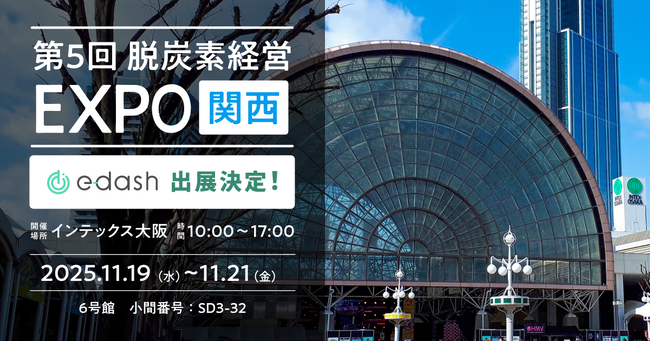 CO2排出量可視化・削減サービスプラットフォーム「e-dash」を提供するe-dash株式会社(本社:東京都港区、代表取締役社長:山崎冬馬、読み:イーダッシュ、以下「当社」)は、2025年11月19日(水)~11月21日(金)にインテックス大阪で開催される「第5回 脱炭素経営 EXPO【関西】」に出展します。