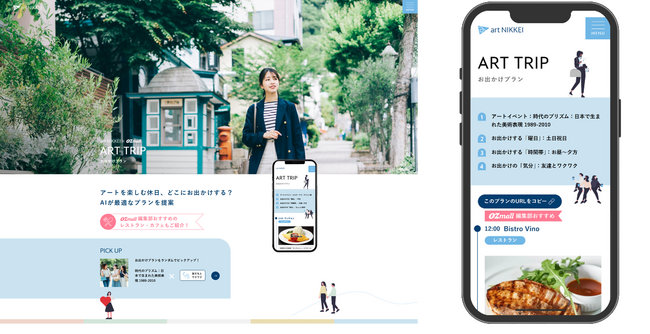 アートイベント、曜日、時間帯、気分を選ぶだけでAIがおすすめのお出かけプランを作ってくれるart NIKKEIの『ART TRIP』。OZmallが連携をスタートし、OZのレストラン予約で掲載している約4000店舗の中から、アート鑑賞後や合間におすすめのレストランやカフェを紹介します。お出かけプラン作成時にそのまま予約することも可能なので、お店探しの手間が省けたり、当日混雑して入れないといったお困りごとを解消。素敵な休日のお出かけを応援します。[画像2: https://prcdn.freetls.fastly.net/release_image/607/2054/607-2054-2b899c313ef897ea0f12d9e3575888ce-425x646.png?width=536&quality=85%2C75&format=jpeg&auto=webp&fit=bounds&bg-color=fff ]