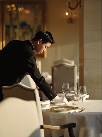 決勝審査は、11月11日(火)に公開形式で実施されました。バンケットホールに設けられた模擬レストランにて、各選手が1名のコミ・ド・ランとともに1卓3名のお客様へフルコースを提供。ゲストの迎え入れから、コミ・ド・ランへの指示・協調性、テーブルセッティング、器材の準備、料理とサービスの知識、お客様との会話力、お見送りまで、サービスの総合力が審査されました。