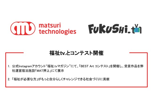 ソフトウェアを主軸に、空間の価値を最大化するソリューション「StayX」を運営するmatsuri technologies株式会社(本社:東京都新宿区)は、「福祉が必要な方」が自分らしくチャレンジでき、「企業」がそのチャレンジを応援する、ウインウインとなる社会を創る会社一般社団法人 福祉.tv(本社:東京都新宿区)と連携しBEST Art コンテストを開催、また、入賞作品を本日より展示することをお知らせいたします。
