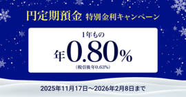 期間中であっても、円定期預金の預入額が一定額に達した場合にはキャンペーンを終了する場合があります。また、金融情勢の変化等により金利水準やキャンペーン期間の見直しをさせていただく場合があります。最新の金利は当社WEBサイトにてご確認ください。