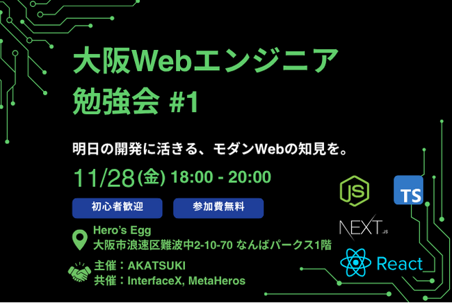 株式会社Meta Heroes(本社所在地:大阪府大阪市、代表取締役:松石和俊、以下「当社」)は、当社が運営するDX教育施設「Hero Egg」にて、「大阪Webエンジニア勉強会 #1 ~明日の開発に活きる、モダンWebの知見を。~」を、株式会社AKATSUKI、InterfaceX株式会社と共同で開催いたします。