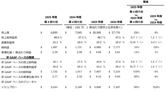 - 通年1株当たり利益:GAAPベースで過去最高の8.66ドル(前年度比1%増)、非GAAPベースで過去最高の9.42ドル(前年度比9%増)