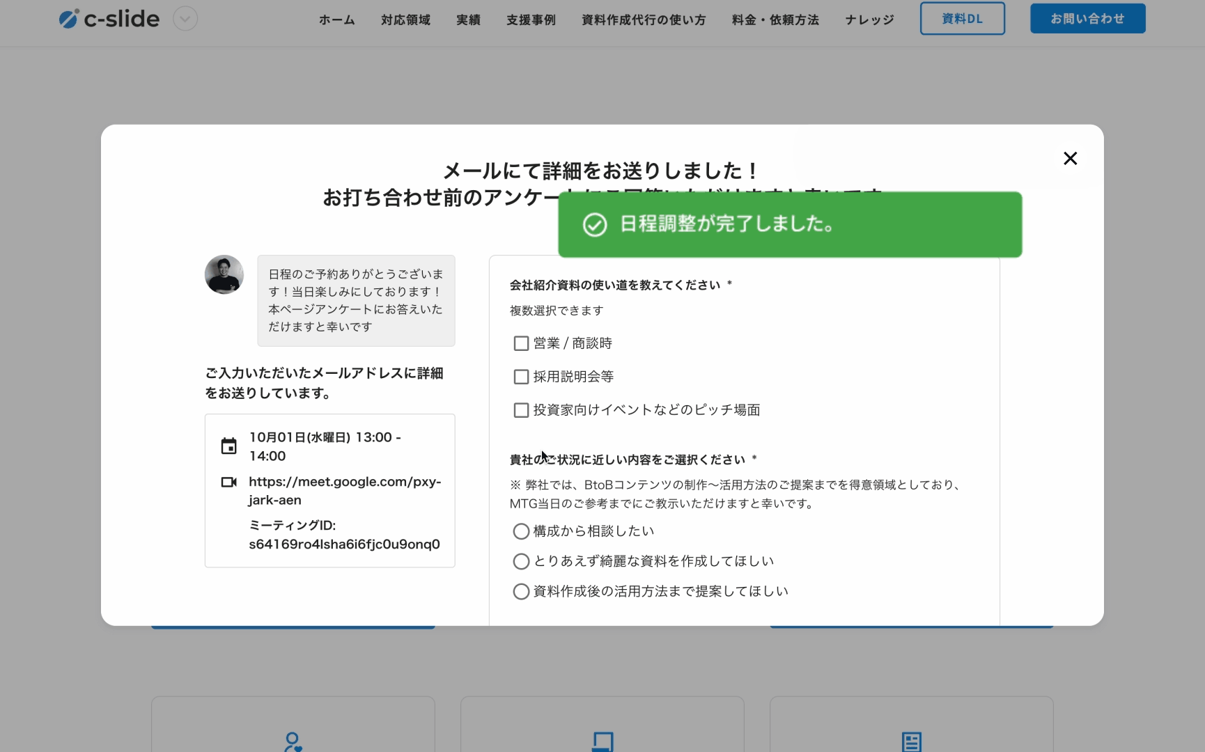 formmateは、資料請求後すぐに担当者の空き日程を提示し、ユーザーはその場で商談予約まで完了できます。