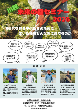 川越市グリーンツーリズム拠点施設(株式会社サンアメニティ)にて、農業セミナー「川越未来の種セミナー~次世代を担う子供たちのためにまいた種をどんな実に育てるのか~」を開催いたします。
