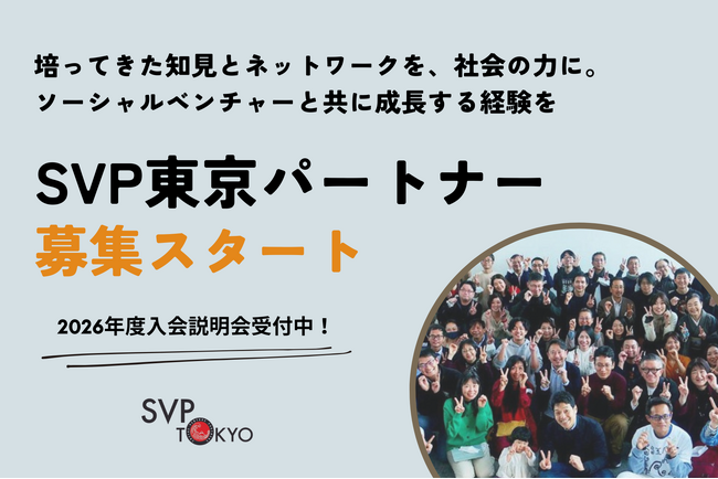 このたび、SVP東京の投資・協働活動を支えるメンバーである「パートナー」の新規募集を開始しました。あわせて、2025年12月7日(日)から2026年1月27日(火)までの期間、全5回にわたり、SVP東京の活動内容やパートナーの役割をご紹介するオンライン入会説明会を開催します。