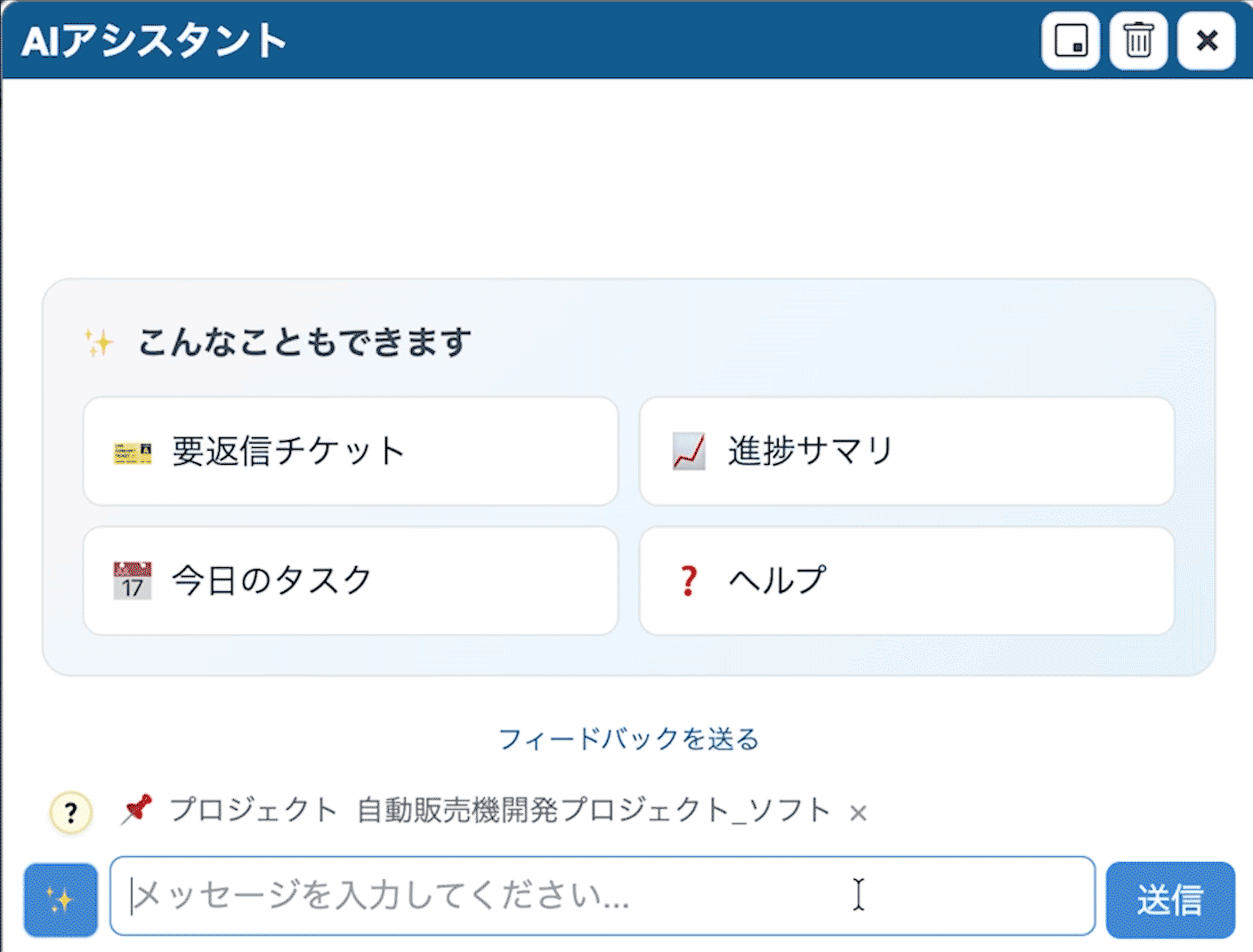 画面上に出現するチャットパネル「AIアシスタント」から、AIに話しかけるだけでチケットの作成・更新・検索・スケジュール調整が可能。プロジェクト管理・タスク管理に慣れていない方もわかりやすいよう、チャットメニューにはよく使う質問をご用意。ボタンひとつでAIに指示を出すこともできます。ツールを習熟していなくても、「今日やるチケットを教えて」「遅れそうなタスクを洗い出して」など気になったことをそのまま聞けば答えてくれるので、画面遷移や検索による思考の流れを止めません。