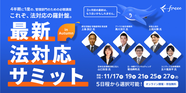 - 厚生労働省や士業の協力をもと、11月19日、21日、25日、27日に「最新法対応サミット」をオンラインにて開催します