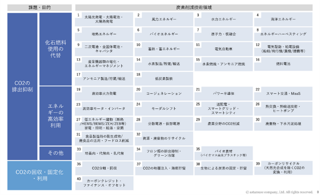 アスタミューゼ、カーボンニュートラル実現へ「脱炭素・低炭素技術40領域」を俯瞰するレポートを発刊