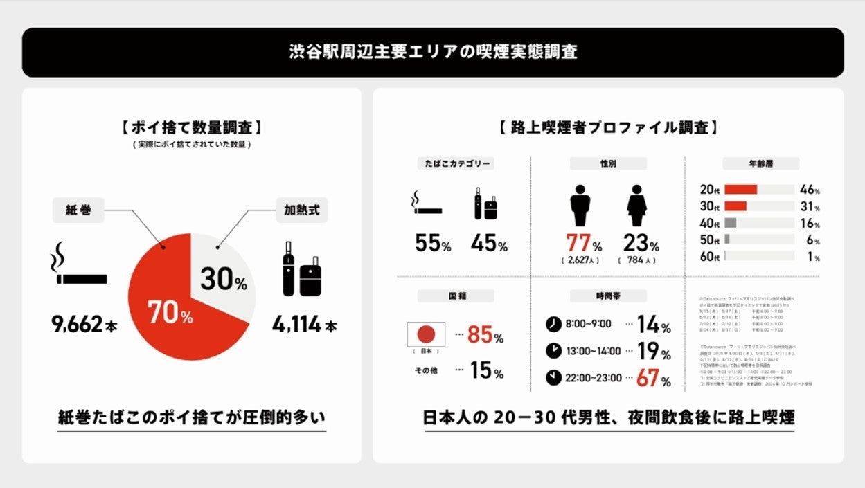 - 路上喫煙者プロファイル調査:6日間で3,411人の路上喫煙者を確認。日本人20-30代男性が77%を占め、67%が夜間22-23時に集中