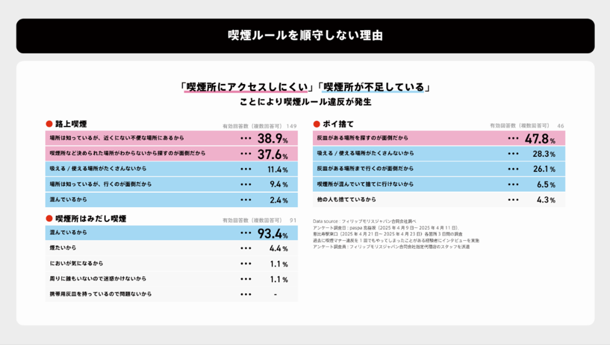 - 定性調査: 路上喫煙の理由として「喫煙所がわからない/探すのが面倒」(37.6%)、「近くにない/不便」(38.9%)、「場所が少ない」(11.4%)が上位を占める。喫煙所はみだし喫煙の理由としては、ほとんどの人が「混んでいるから」(93.4%)と回答。