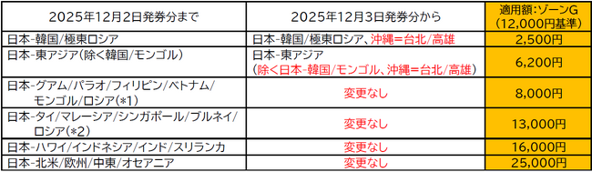 1) 2025年12月3日(水)から2026年1月31日(土)までの発券分については、今後の航空燃油価格 の水準にかかわらず、上記適用額からの変更は原則行いません。ただし、政府認可状況により、金 額や改定時期、適用期間が変更となる場合があります。