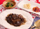 副菜は、さっぱりと仕上げたブロッコリーツナサラダ、ハニーマスタード味がやみつきのかぼちゃアーモンド、うまみたっぷりのアサリと紫キャベツのマリネです。