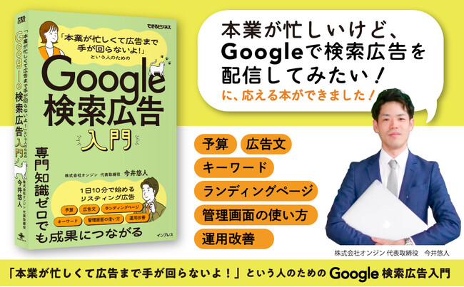 Web広告の運用代行を軸としたマーケティング支援を行う株式会社オンジン(本社:愛知県名古屋市、代表取締役:今井 悠人)は、代表の今井 悠人が執筆した書籍『「本業が忙しくて広告まで手が回らないよ!」という人のためのGoogle検索広告入門』が、2025年11月18日(火)に株式会社インプレスより発売されることをお知らせします。