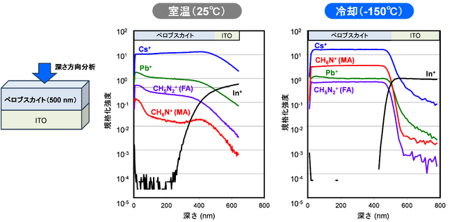 本技術は、試料冷却下でGCIB-TOF-SIMS(ガスクラスターイオンビーム照射型の飛行時間型二次イオン質量分析法)※2を適用することで、従来は困難だった分析中の有機成分の揮発やペロブスカイト材料の変性を大幅に抑制し、ペロブスカイト太陽電池本来の層構造を忠実に反映した解析を可能にしました。