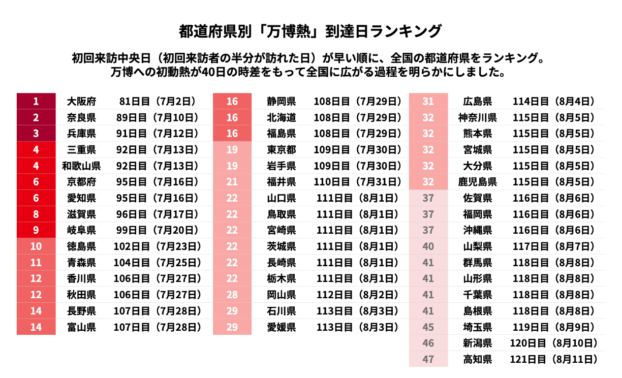 そこで、万博開幕以降の時期を5つに分類し、各都道府県からの初回来訪中央日がどこに該当するかを分析することで、地域間での初動熱量のばらつきと全国への波及実態を明らかにしました。