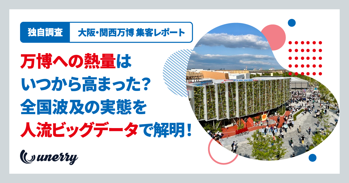 大阪・関西万博は累計来場者数(関係者含む)約2,901万7,900人を記録し、閉幕しました。開催前にはさまざまな意見が交わされましたが、終盤にかけては駆け込み来場も急増し、9月末には入場券販売が打ち切られるほどの賑わいを見せました。しかし、この「万博熱」の盛り上がりには、地域によってタイミングに差があったように見受けられます。そこでunerryは、国内約2.4億ID超の人流ビッグデータを保有するリアル行動データプラットフォーム「Beacon Bank」を活用し、万博来場者の行動を分析。各都道府県からの初回来場タイミングやリピート訪問の傾向を可視化することで、万博熱が全国にどう広がっていったのかを明らかにしました。