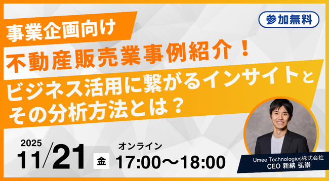 Umee Technologies株式会社(本社:東京都調布市、代表取締役:新納 弘崇)は、インサイト分析に高い関心を持ちながらも、分析のハードルの高さや結果の不明瞭さから踏み出せずにいる事業企画担当者を対象に、「不動産販売業事例紹介!事業企画向け、ビジネス活用に繋がるインサイトとその分析方法とは?」と題した無料オンラインセミナーを、2025年11月21日(金)に開催いたします。