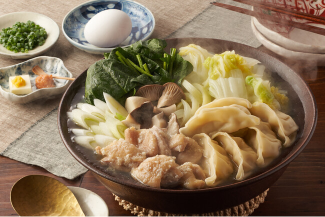 本メニューは俳優・小雪さんとの初めてのコラボです。小雪さんは、俳優として活動しながら3人のお子さまを育てています。忙しい毎日でも家族に栄養たっぷりで楽しい食卓を用意したいという想いを込めて、旨みがじんわりと染みる、具沢山な鶏だし塩鍋が誕生しました。本メニューでは、白菜やほうれん草、長ねぎなど、甘みが増した旬野菜の旨みが感じられる鶏だしベースのスープに、塩麹やおろしにんにく、生姜も加えることで、上品ながらもしっかりとした深みある味わいに仕上げています。塩糀でもみ込んだしっとり食感の鶏肉だけでなく餃子も入っているので、お子さまにも食べやすくボリューム感ある仕上がりです。鍋の途中の味の変化として、ゆずペーストを添えたバター、新潟の伝統的な辛味調味料であるかんずりと山わさびを混ぜた2種の合わせだれを用意。旨みたっぷりながらシンプルな味わいなので、トマトや豆乳を足したり、うどんやラーメンを加えたりと、ご家庭で自由にアレンジをして楽しむこともできます。〆は、スープの旨みを余すことなく堪能できるたまご餡かけごはん。最後まで飽きずに楽しめます。