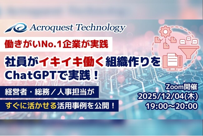 アクロクエストテクノロジー株式会社(本社:神奈川県横浜市、代表取締役:新免 流、以下、アクロクエスト)は、中小企業の経営者および総務・人事担当者を対象としたオンラインセミナー「【働きがいNo.1企業が実践】社員がイキイキ働く組織のChatGPT活用法」を、2025年12月4日(木)に開催いたします。