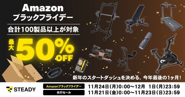 Amazon にて 2025 年 11月24日(月)0:00から12月1日(月)23:59 まで開催される「Amazon ブラックフライデー」、および 11月21日(金)0:00から11月23日(日)23:59 まで開催される先行セールにて、100 以上のホームフィットネス / ストレッチ製品を最大 50%OFF にて販売します。今年の冬こそ“なりたい自分”への一歩を踏み出したい方へ、STEADYからのビッグエールです。