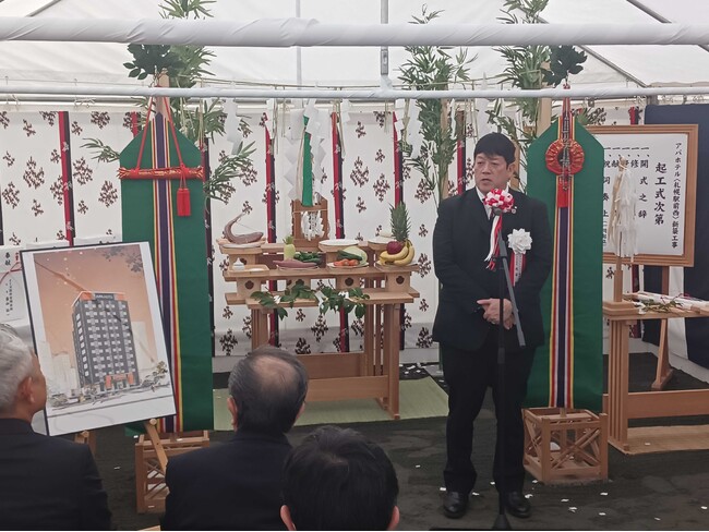 全国でホテルネットワークを展開する総合都市開発のアパグループ(本社:東京都港区赤坂3-2-3 CEO:元谷一志)は、本日、アパホテル〈札幌駅前西〉(全168室)の計画地(北海道札幌市北区北六条西6-3-1)において起工式を執り行った。神事後の挨拶において、アパマンション株式会社 代表取締役 元谷 拓は、「本日、アパホテル〈札幌駅前西〉の起工式を執り行うことができ嬉しく思う。札幌の新築工事においては分譲マンションの建設から始まり、本年7月にはアパホテル&リゾート〈札幌駅前〉の起工式を行った。また既存ホテルのスクラップ&ビルドにより、来月12月18日にアパホテル〈札幌大通駅前西〉が開業を迎えることになる。政令指定都市である札幌市は、大通やすすきのといった人気エリアを有し、新千歳空港からのアクセスも良い。人も街も建築技術も進化していく。イノベーションポイントを取り入れて、より良い環境対応型のホテルとなるよう努めたい。訪れたお客様に「価値ある称賛」を頂き、このホテルがあって良かったと言われる建物となるよう、無事故・無災害で竣工を迎えたい。」と述べた。